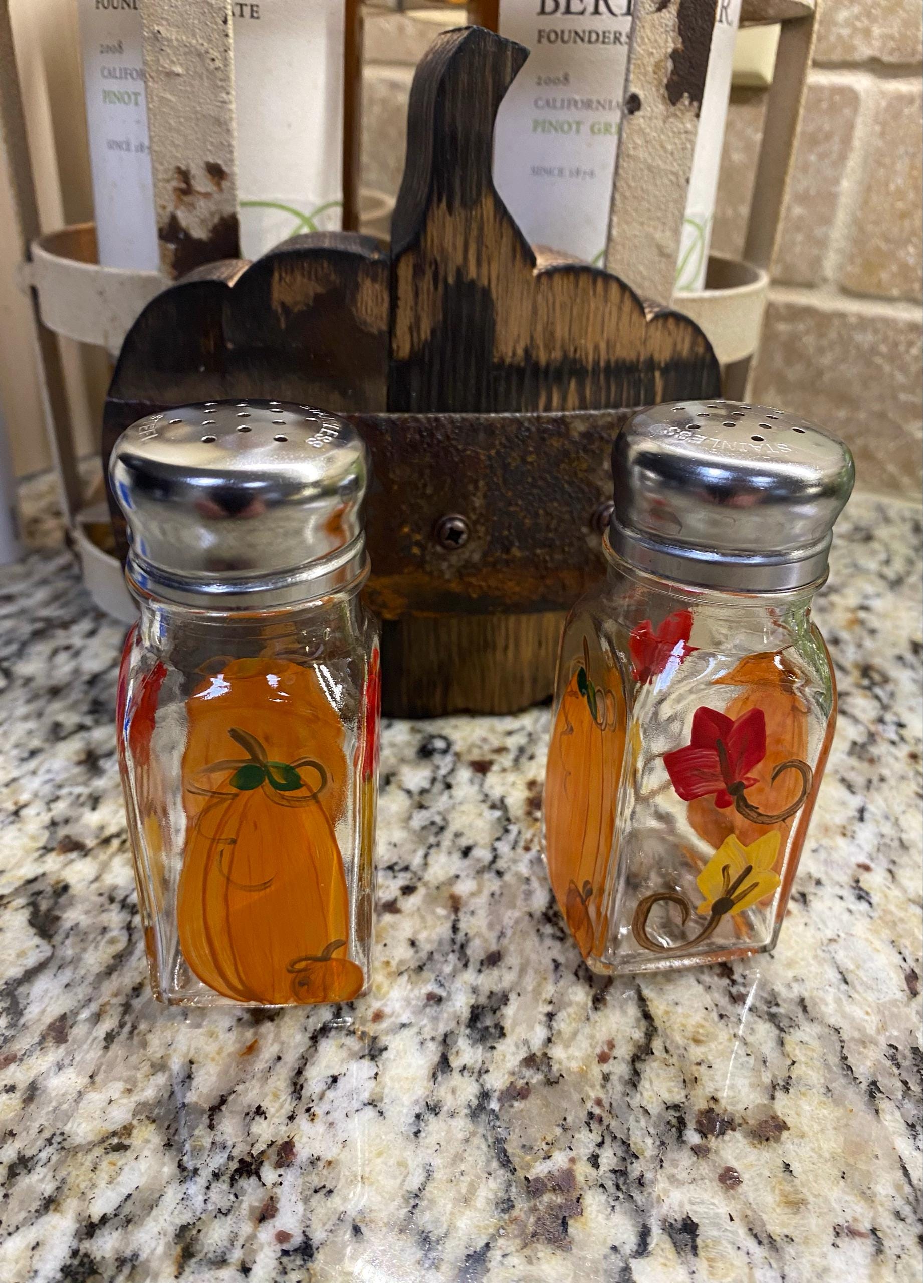 These colorful Fall shakers have burnt orange pumpkins on two sides and deep red and yellow leaves on the other two. The size is 3 3/4" tall and 1 3/4" wideThey will add extra interest to your beautifully set table. Great for everyday as well. Fall decor that will match any place setting. Gift box included.