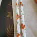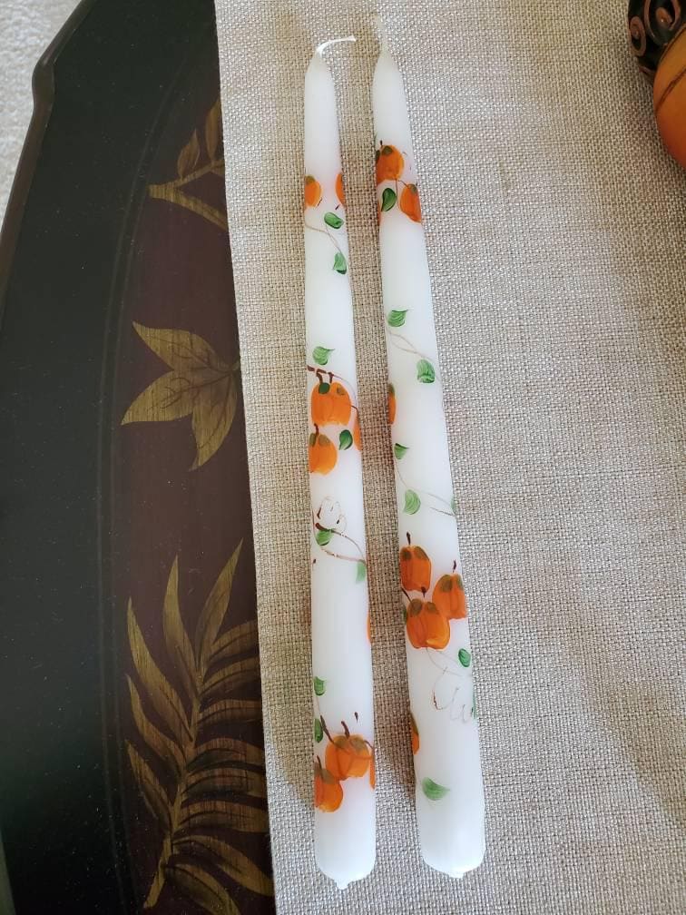 Hand painted pumpkin taper candles, set of two with Fall leaves. A real autumn treasure for your Halloween and Thanksgiving decor. These 12 inch candle sticks are double painted and then dipped in wax again to protect the design and make for easy handling. Cotton wicks give a cleaner burn. The candles are placed in a poly bag with a gold fabric bow for simple gifting.